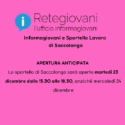 Lo sportello di Saccolongo sarà aperto martedì 23 dicembre dalle 15.30 alle 18.30, anziché mercoledì 24 dicembre. Per fissare un appuntamento 3440966075 oppure info@retegiovani.it