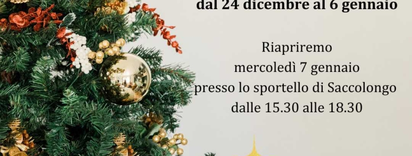 Si informa che i nostri sportelli saranno chiusi da mercoledì 24 dicembre a martedì 6 gennaio.